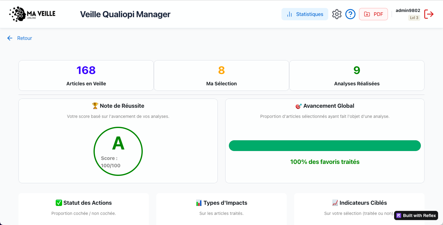 Cette application a été développée spécifiquement pour les Organismes de Formation (OF), les CFA, les centres de Bilan de Compétences (CBC) et les validateurs VAE soucieux de maintenir leur certification Qualiopi sans y passer des heures.